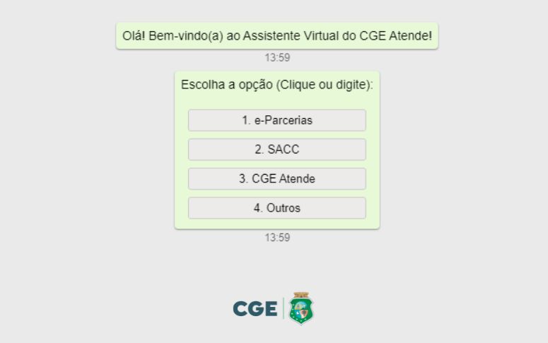 O CGE Atende, ferramenta de gestão de demandas e suporte técnico aos sistemas corporativos da Controladoria e Ouvidoria Geral do Estado (CGE), disponibilizou um assistente virtual para otimizar o atendimento aos usuários dos serviços oferecidos pelo órgão. O objetivo é esclarecer dúvidas frequentes, reduzindo a necessidade de atendimentos presenciais e por telefone.