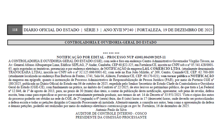 A Controladoria e Ouvidoria Geral do Estado do Ceará (CGE), em conformidade com o disposto no § 7º do art. 14 do Decreto nº 33.951/2021, publicou edital de notificação da pessoa jurídica L&L Comércio LTDA, atualmente denominada TRANSCEARA LTDA, inscrita no CNPJ sob o nº 32.125.666/0001-62, para apresentação de defesa escrita em Processo Administrativo de Responsabilização (PAR), instaurado por meio da Portaria nº 180/2025.